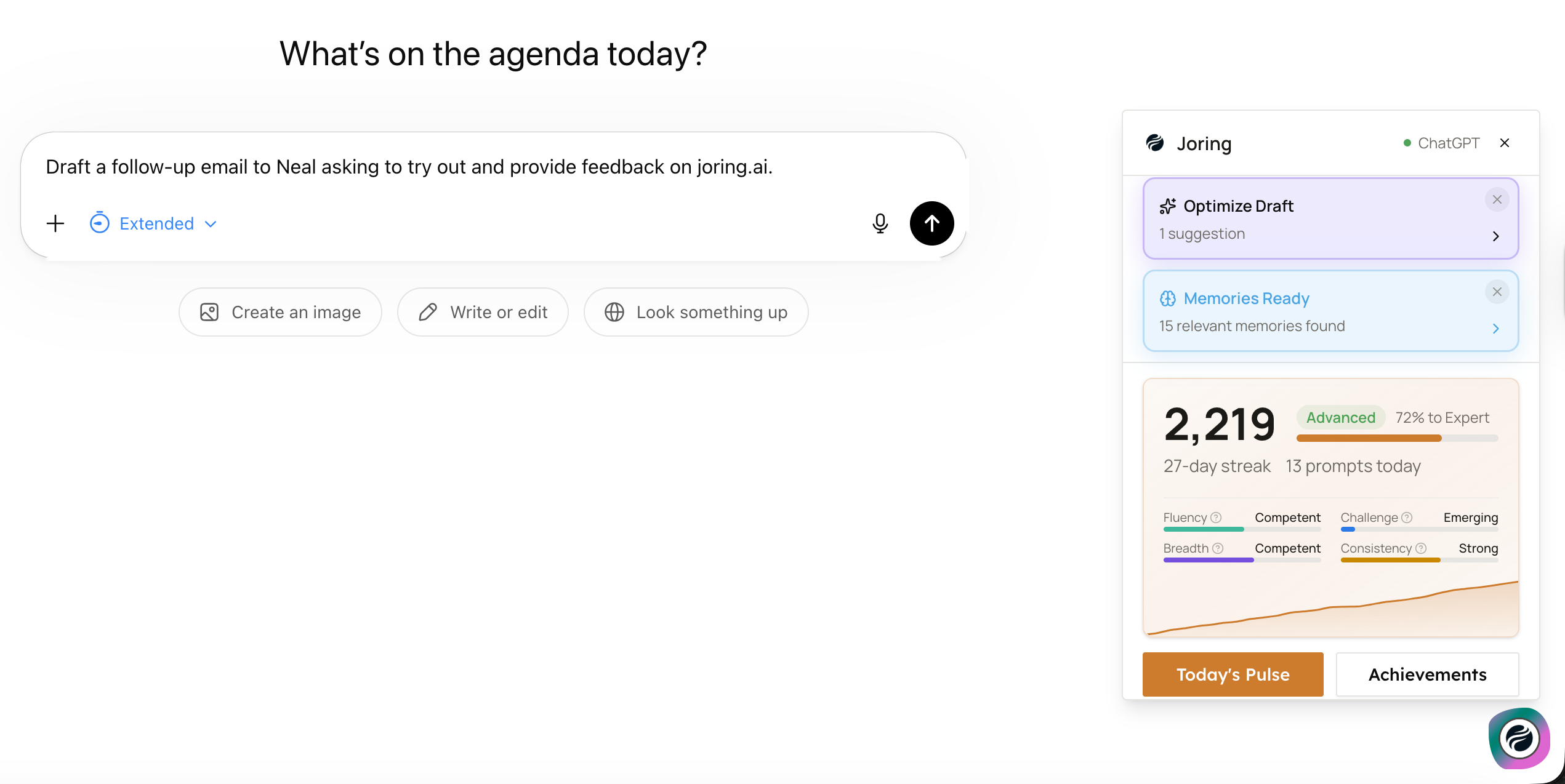 Joring suggests what context to add to your prompt and pulls in the right background from your previous work, before you hit send. Get a usable answer the first time, not after five rewrites.